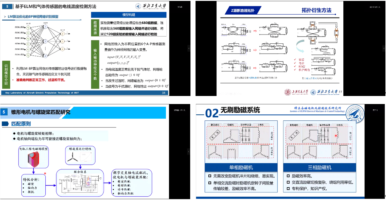 姚文利副教授针对飞机过温检测及火灾预警问题,作“基于热解挥发物的飞机导线过温检测方法研究”专题报告;倪骏康副教授围绕飞机二次电源健康管理和航天电源故障诊断研究,作“电源系统故障诊断和健康管理”专题报告;周中正副教授针对新能源与多电移动平台直流网架故障保护问题,作“Z源固态直流断路器:拓扑、建模及控制”专题报告;梁培鑫助理教授聚焦电动飞机推进电机轴向力与散热问题,作“电动飞机电推进系统用锥形电机研究”专题报告;焦宁飞副研究员针对航空三级式无刷同步起动发电系统起动阶段面临的技术难点及问题,作“航空无刷同步起动发电一体化技术”专题报告。民航学院闫浩副教授聚焦基于相电流重构的永磁同步电机容错控制研究,作“永磁同步电机相电流重构控制策略研究”专题报告;吴宇副教授针对常规能量管理策略在主电源为三级式发电机的混合能源系统中存在的局限性,作“高均峰比多电飞机的混合能量管理系统研究”专题报告。各个报告紧扣前沿,内容详实,得到了与会专家同行的一致好评。