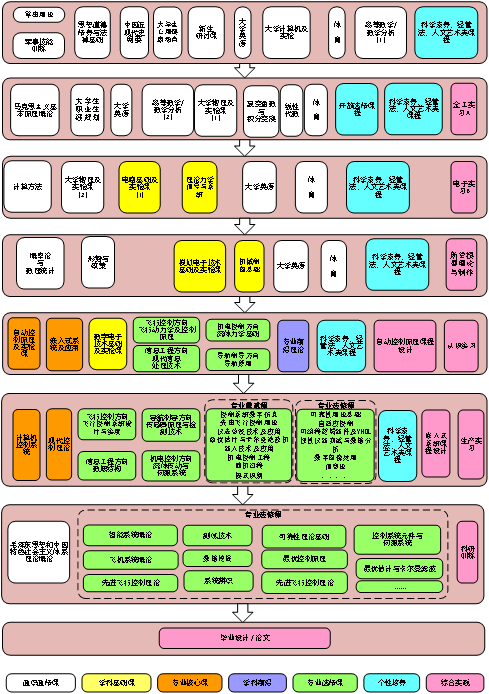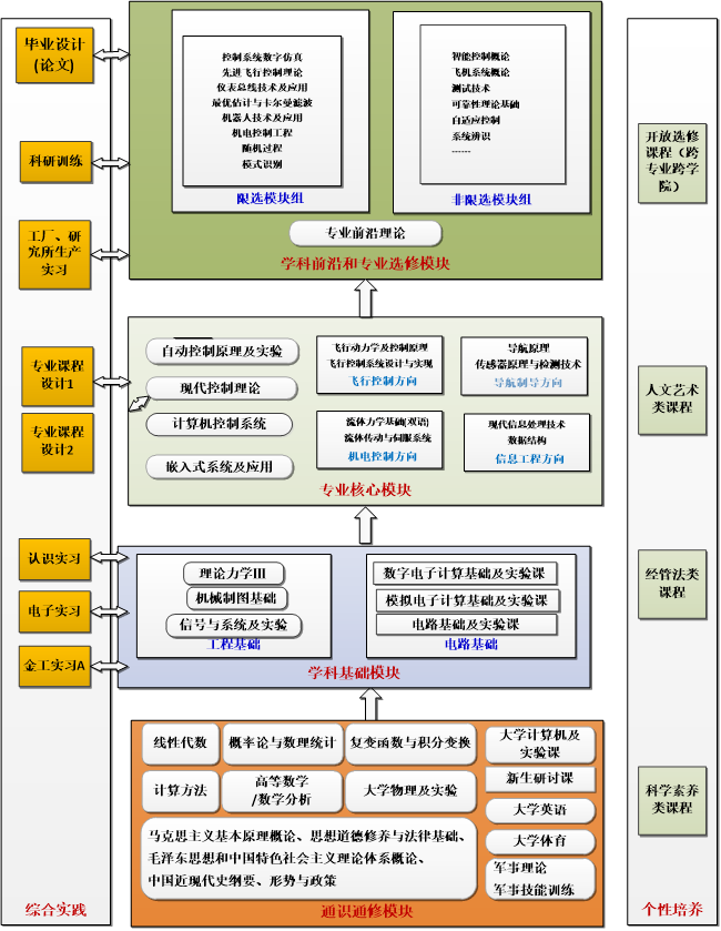 自动化专业包含飞行控制、导航制导、机电控制、信息工程四个专业方向,专业核心课程中有7个学分按专业方向分为四组,各组课程的门数、学分均相同,学生可任选其中一组作为自己的主修方向。