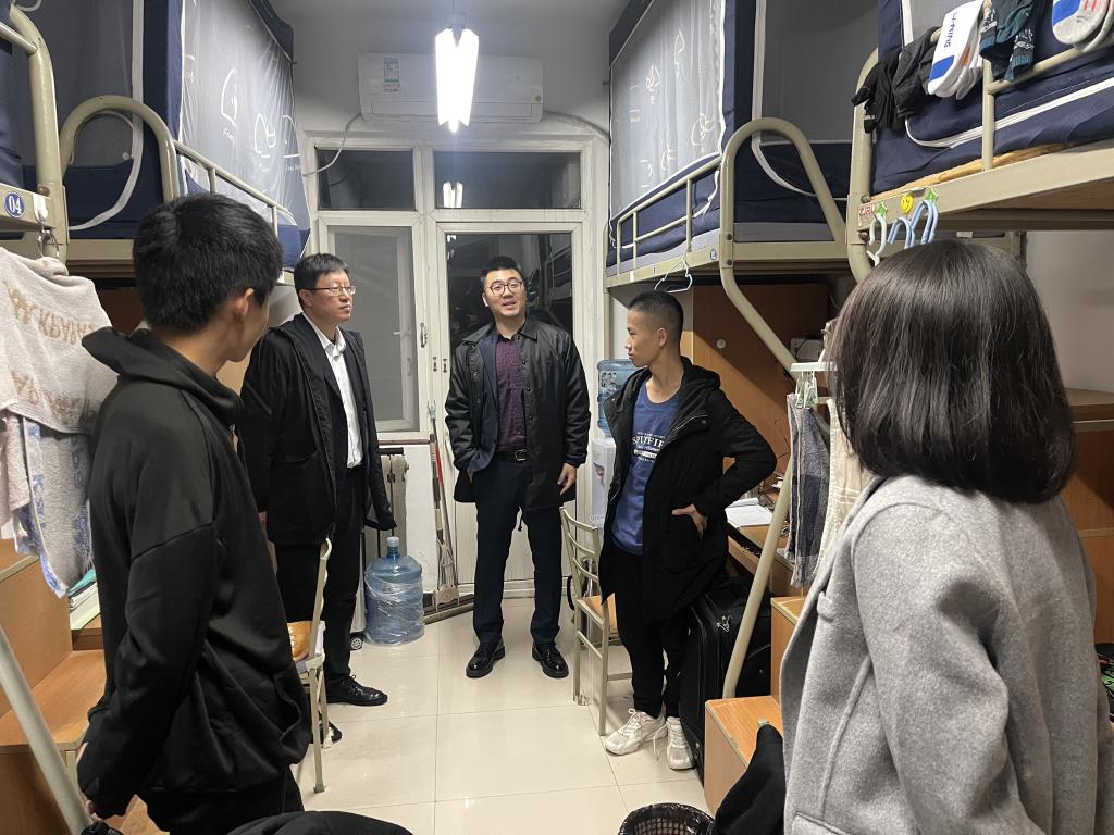 韩军伟书记带领副书记及各年级辅导员深入学生宿舍重点排查了违规电器使用、宿舍卫生等问题,督促大家增强安全意识,切实保证人身财产安全,始终绷紧“安全弦”。韩军伟书记还深入了解学生的学习与生活情况。