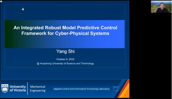 杜宇华教授与西安交通大学张萌副教授分别主持两场报告,加拿大施阳院士首先作题为“An Integrated Robust Model Predictive Control Framework for Cyber-Physical Systems”的报告,总结了在设计、实施、部署和操作CPS方面的主要行业需求和挑战,提出了一个集成的鲁棒MPC和云MPC框架。