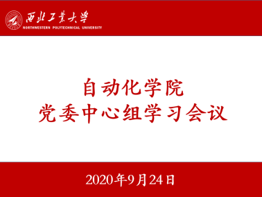 党委于2020年9月24日召开中心组学习视频会议学习习近平总书记近期系列讲话精神。学院党委书记潘泉,院长黄攀峰,党委副书记李伟林、马玥,党委委员王长青、智永锋参加此次会议,副院长刘准钆、许斌、王小旭列席本次会议。本次会议由潘泉书记主持。