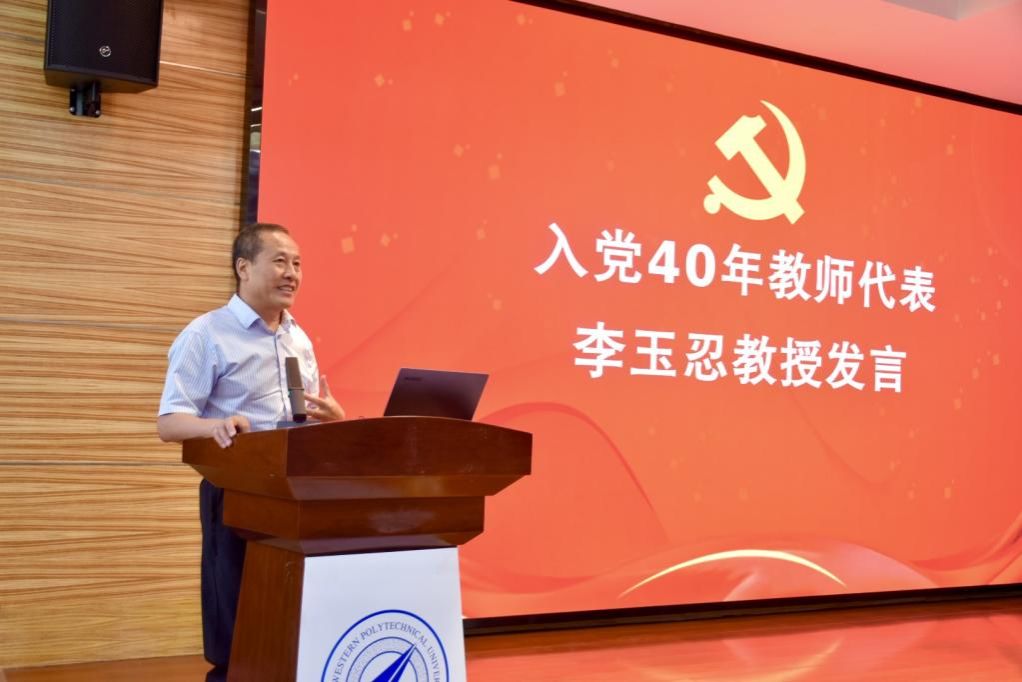 入党40年教师党员代表李玉忍教授为大家讲述了个人入党历程以及入党40年的奋斗感想,并深情回顾了学院的建设发展历程。他勉励青年师生,要爱岗敬业、奋勇拼搏,做一名合格的共产党员;要做到爱党、爱国、爱校,努力为强国建设、民族复兴贡献西工大力量。