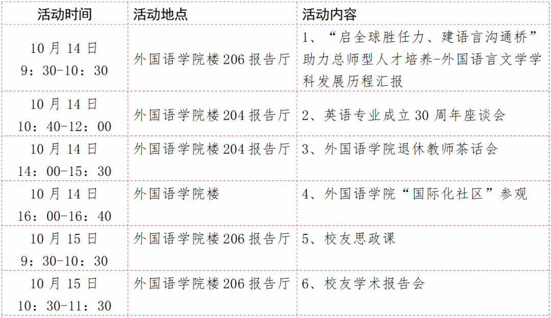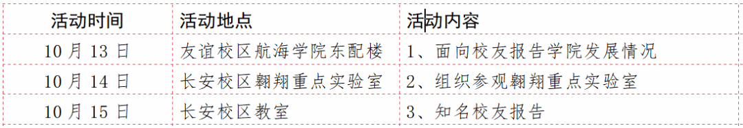 注:上述表格中的8:30-9:00、15:45-16:45两个时段分别为集中乘车出发和返程的时间,请校友们务必按时乘车。