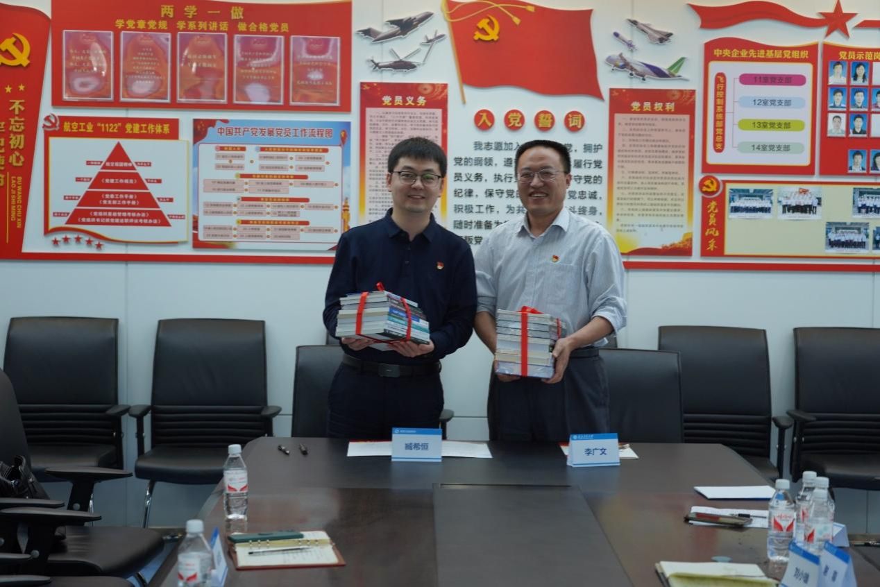 共建交流环节,李广文和臧希恒签署了支部共建协议书,管峻和吴雪梅分别向双方支部书记授支部共建牌,共建内容明确包含以面向技术创新需求、共创一项活动,聚焦飞控导航专业发展态势、共破一个难题,聚焦党的二十大精神学习、共上一堂党课。导航制导与控制系向12室党支部赠送了支部教师近年来撰写的学术专著,12室党支部回赠了飞控和导航专业书籍。