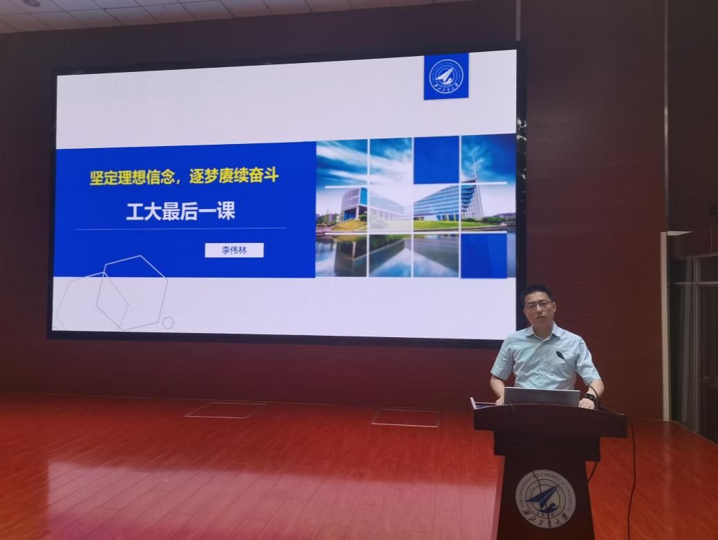 于教西D100报告厅召开2023届本科毕业“工大最后一课”专题大班会。学院党委副书记(主持工作)李伟林教授以“坚定理想信念,逐梦赓续奋斗”为题,为2023届本科毕业生倾情讲授了精彩一课。2019级本科生辅导员白浩、周中正及2023届全体本科生参与学习。会议由白浩主持。