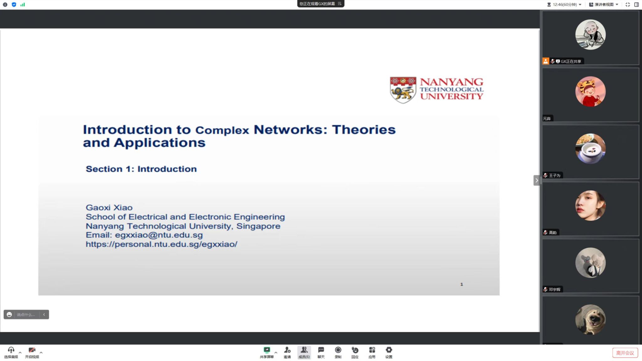 《复杂网络:理论及应用》由学院余孝军副教授邀请新加坡南洋理工的Xiao Gaoxi教授在线讲授。Xiao Gaoxi老师授课风格严谨又不失风趣,通过采用在线推导公式、动画演示等方式,积极回答学生疑问和讨论,激发了学生们的学习兴趣和激情。通过本课程的学习,开拓了学生们的视野,使学生们了解了如何使用复杂网络分析和解决现实问题,认识了复杂网络在现实生活中的重要作用,如疾病传播预测、经济发展预测等应用领域,并为后续开展相关领域的研究打下坚实的基础。