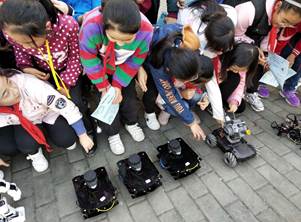 演示活动结束后,同学们近距离观看并体验各个机器人。该环节中,快速游动的仿生机器鱼引起了孩子们的极大兴趣。老师们为小学生现场讲解了机器人的基本原理,并鼓励他们好好学习,将来成为机器人发明家。