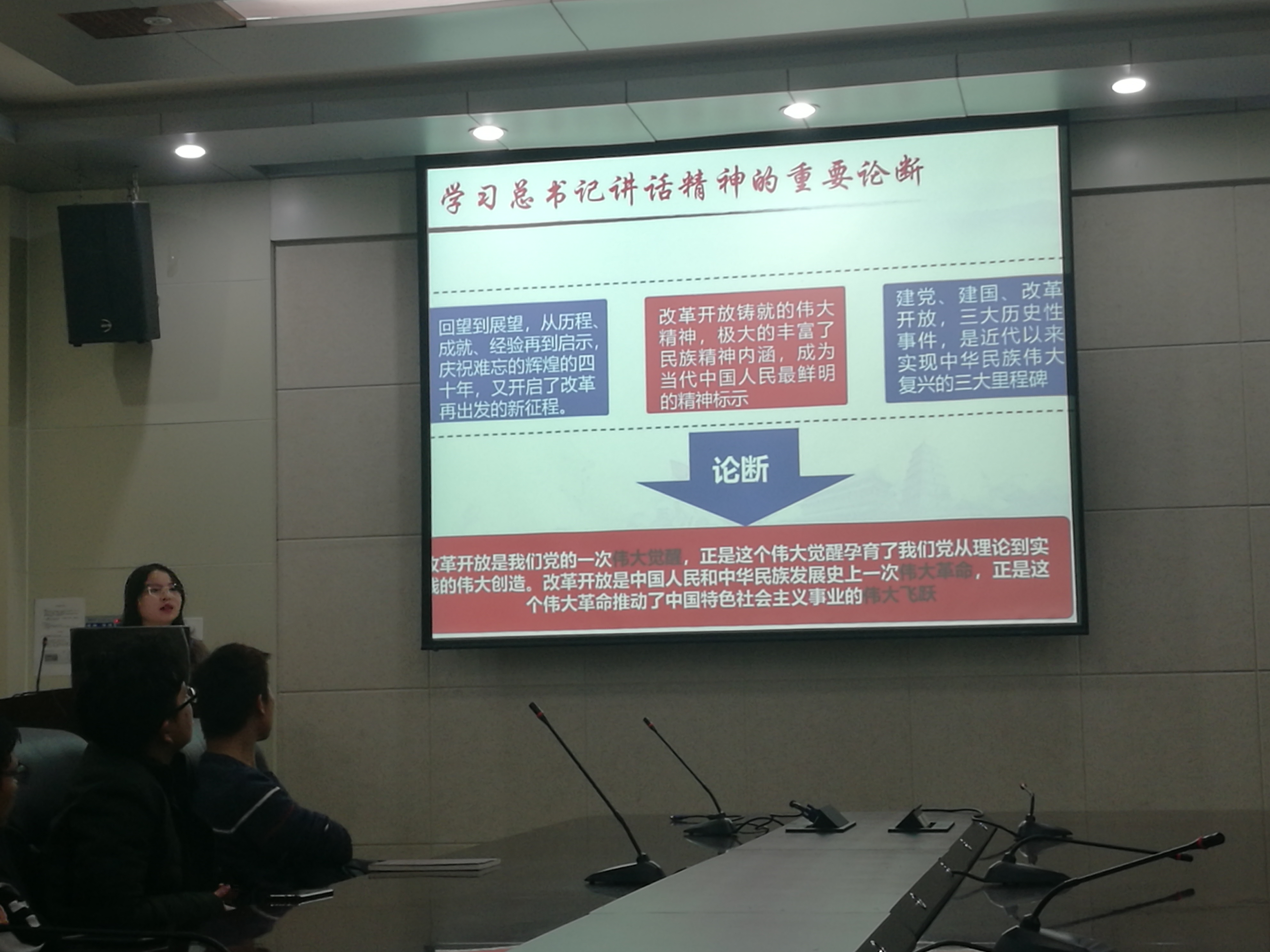 接下来,党建理论研习社的席丹同学以“学习习近平总书记在庆祝改革开放40周年大会上的重要讲话精神”为主题讲授了微党课。