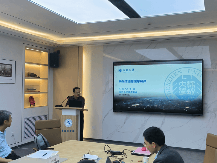 随后,深圳大学贾森教授作题为“高光谱图像信息解译”的学术报告。贾教授简要介绍了高光谱图像的特点和应用场景,并汇报了团队近年来在高光谱图像质量改善、特征挖掘和地物分类等方面取得的研究进展;最后介绍联合高光谱图像、多光谱图像、无人机LiDAR数据、背包LiDAR数据等多源遥感数据在树种分类和单株识别中的应用。