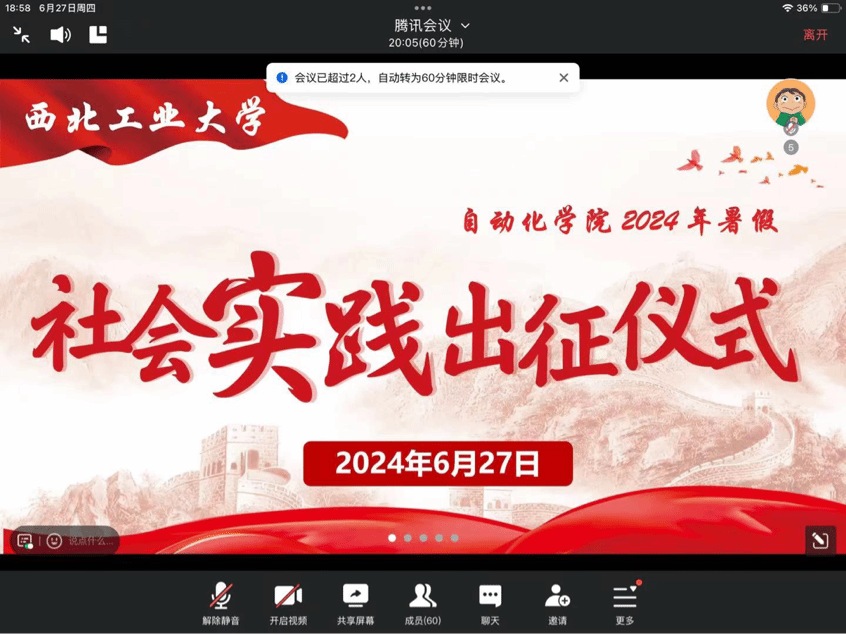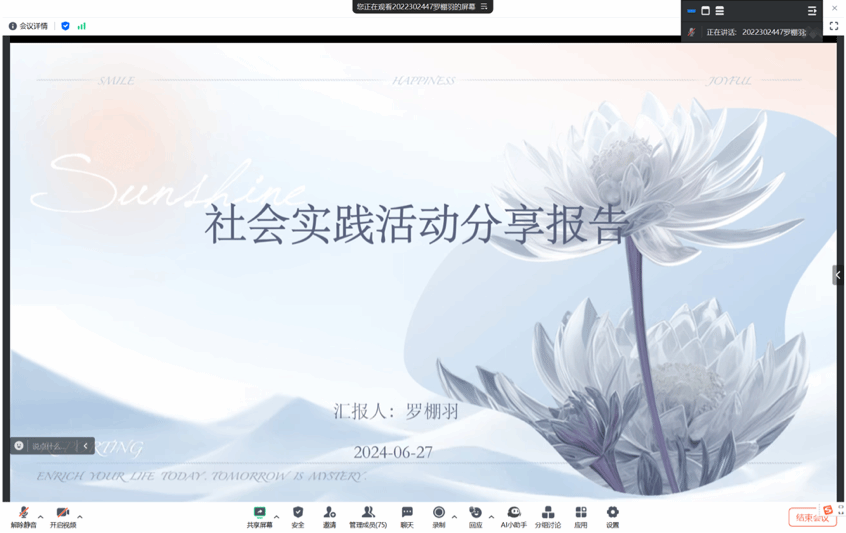 2024年暑期社会实践出征仪式在线上举行。本次会议邀请了优秀实践队学生代表张文馨、罗棚羽进行经验分享,会议由学院团委学习实践部负责人李乐文主持。