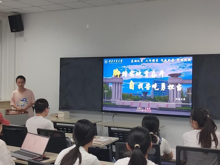 支部委员,曾获国家奖学金、国家级机器人比赛冠军、志愿时长超1000小时的王逸非同学,以“稳扎稳打,九九为功”为主题分享了学习、竞赛及志愿服务等方面的经验。他提出绩点是基础,科研竞赛和社会活动也需齐头并进,希望同学们能加强统筹规划,实现全面开花。