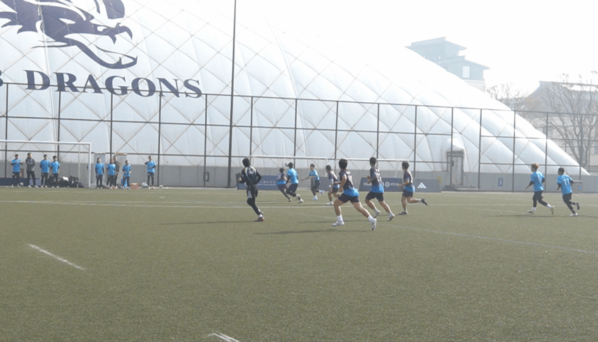 橄榄球代表队迅速组织进攻,整个队伍衔接紧凑,向对手施加压力。在第一次尝试达阵未果后,球权转换,队员们凭借严密的防守阻止了对手的进攻。球权再度转换,进攻过半场后,李左接球开始实施边路二打一战术,接球队员突破防线,成功达阵拿下第一球。接下来的比赛中队员们势如破竹,成功再收获一次达阵,以2:1的胜利赢下首场比赛。