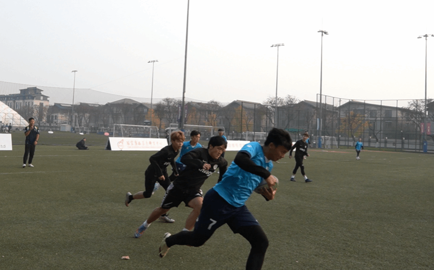橄榄球代表队拿出了百分的专注和韧劲进行攻防。双方轮番进攻数次均未打开局面,比赛局势十分焦灼。在一次的进攻中,姚良涛抓住机会带球启动,随后将球传给李左,李左凭借着速度优势完成达阵,为队员增加信心、注入强心剂。但在后面的防守中,以3:2的比分憾负北京工商大学。