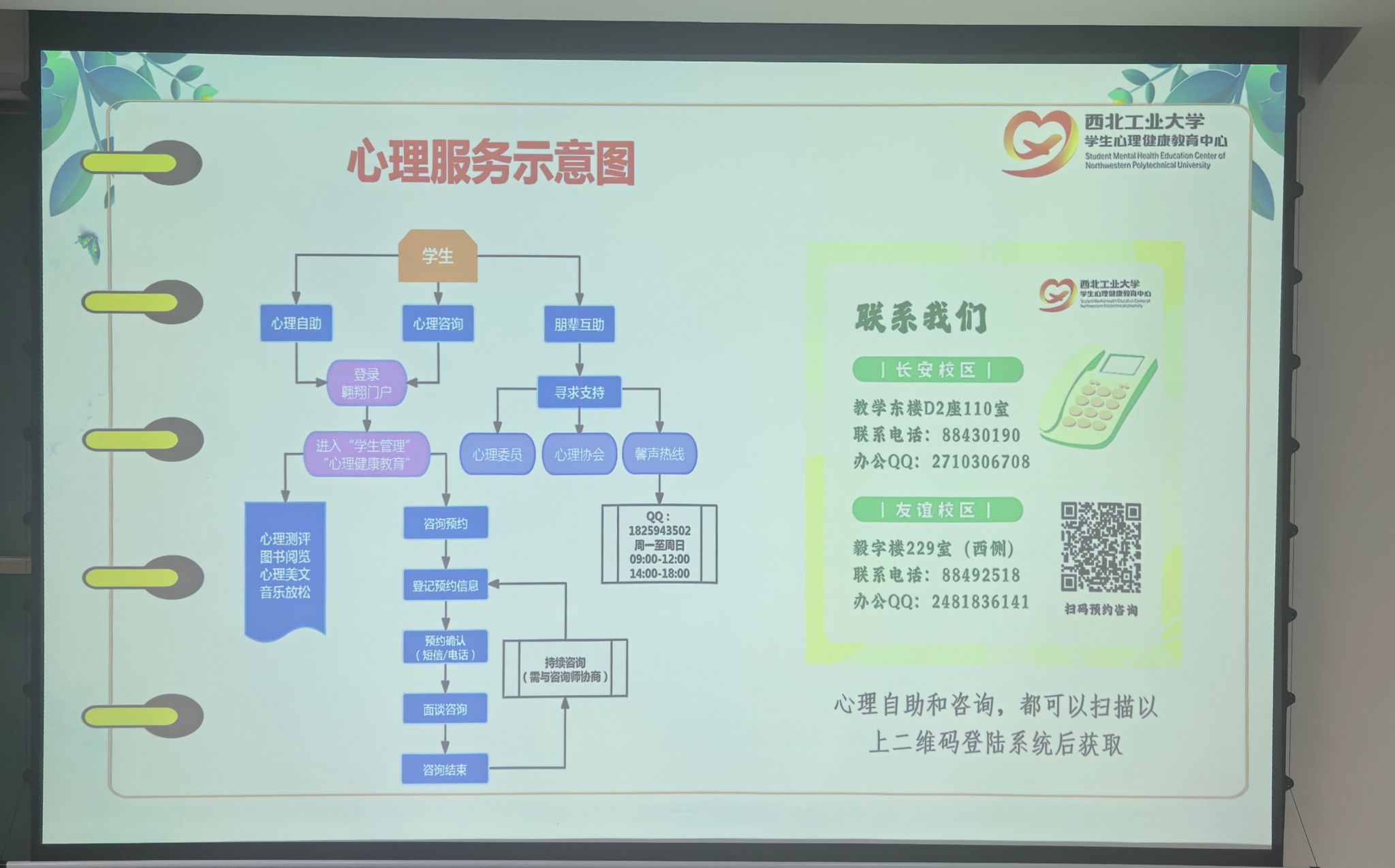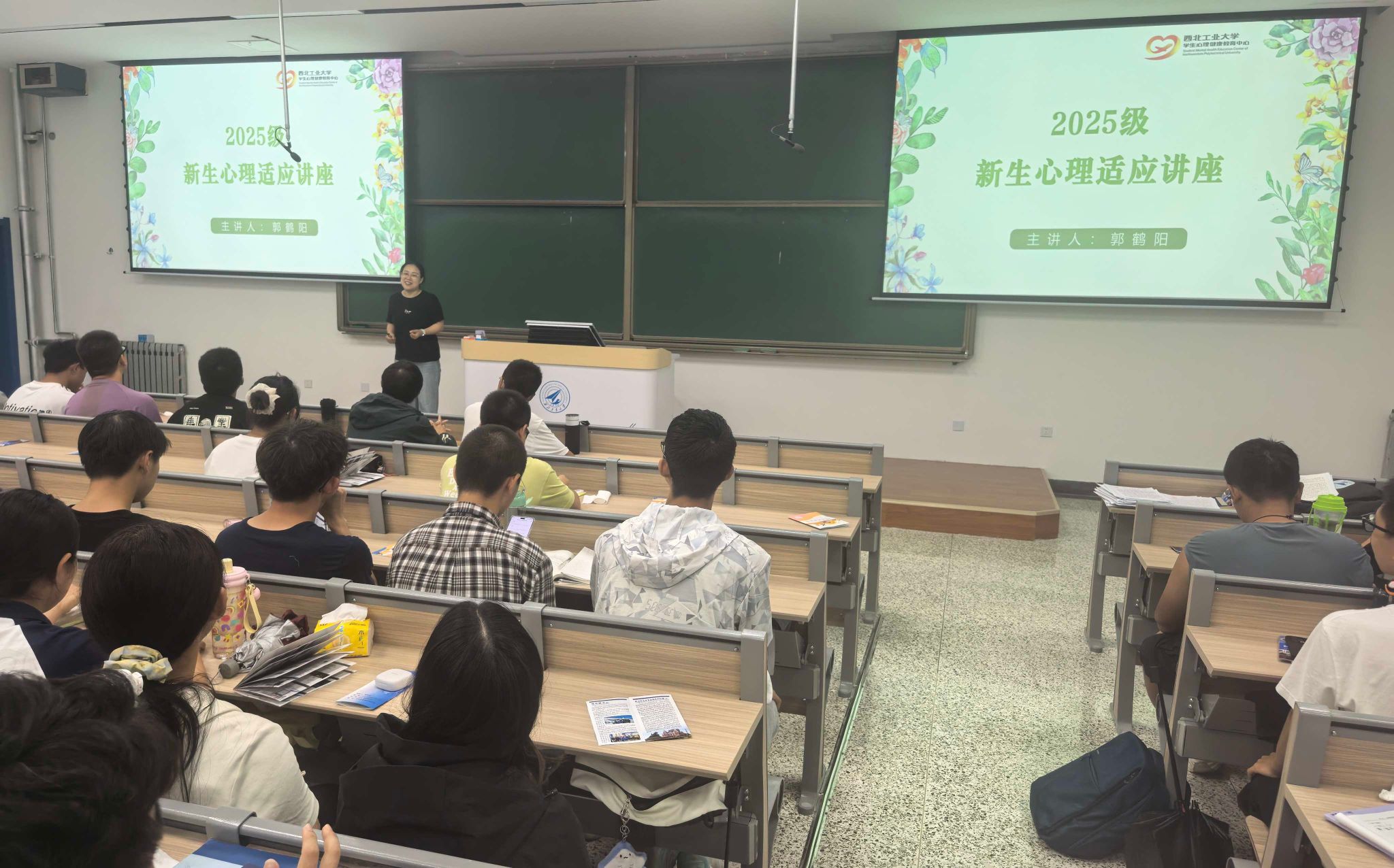 最后,郭老师讲解了大学生心理适应不良的具体表现以及可能影响大学生心理适应的来源,并提出了大学生心理适应的调适策略,分享了学校丰富多彩的心理健康服务。她指出,心理健康教育中心始终致力于为每一位西工大学子提供服务,除了常规的心理咨询,还有形式多样的朋辈互助、心理游园会、手语操大赛等活动,为同学们排忧解难。讲座最后,郭老师祝愿在场的 2025 级新生们都能拥有美好的心灵,具备爱与成就的能力!