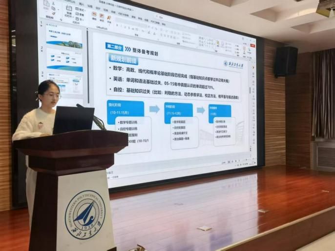 第二位分享的是段晨晨,她以405分考入本院控制科学与工程专业。她从三个方面分享了考研备考的宝贵经验:第一是备考安排,在数学复习中,她推荐关注一些高质量的线上学习资源,在强化阶段可参考主流辅导课程与真题解析;英语备考则注重词汇积累和真题精读;政治科目建议结合经典习题集及刷题工具进行训练;专业课则可利用相关平台的每日习题推送,并加强真题模拟与错题复习。第二是学习方法,她强调要建立错题本,通过历年真题梳理出高频考点,总结出关键解题规范,定期复盘,避免重复犯错。第三是心态调整,“不要和别人比进度,只和昨天的自己比”,这是她始终坚持的原则。她建议大家接受备考过程中的焦虑和疲惫,通过运动、看电影等方式适当放松,保持劳逸结合。