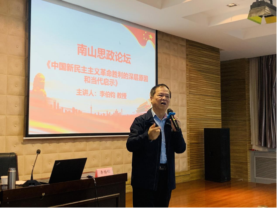 举办南山思政论坛系列讲座,2021年10月9日,首期讲座邀请哲学教授、西安市政协常委、西安市政协决咨委专家、陕西省委党校特聘教授李伯钧为学院青年教师、积极分子讲授《中国新民主主义革命胜利的深层原因和当代启示》党课。学院党委副书记马玥、管峻及百余名师生现场聆听,本次活动由管峻副书记主持。