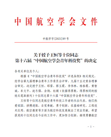 2021年11月3日,中国航空学会正式公布《关于授予王恒等十位同志第十六届“中国航空学会青年科技奖”的决定》文件,巨乳做爱
