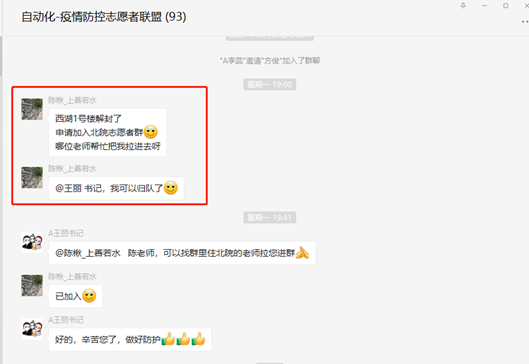 教工志愿者联盟”,截至12月29日,联盟人数就已近百人。联盟成立以来,每天联盟微信群里都流淌着奉献者的感动之歌:有的老师因所在小区封控无法志愿服务而遗憾;有的老师因“抢”到了志愿服务名额而骄傲自豪;还有的老师在小区解除封控的第一时间就向组织报告并请求“战斗”……