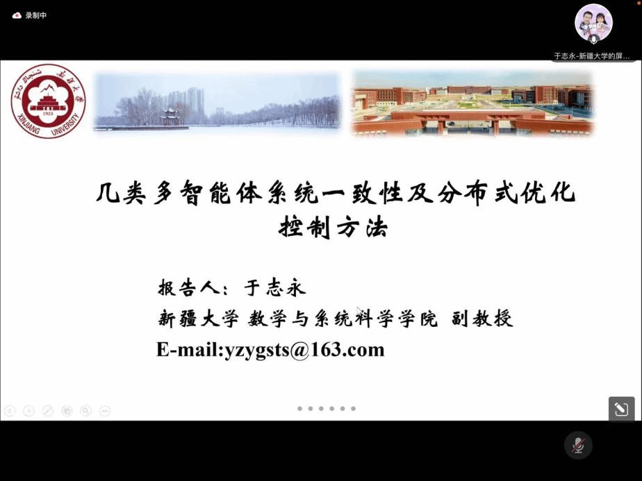 的李慧平教授做了题为“海洋航行器模型预测控制”的学术报告,西安电子科技大学的郑元世教授做了题为“基于博弈的多智能体系统协同控制”的学术报告,国网青海省电力公司清洁能源发展研究院新能源产业发展研究中心的杨立滨副主任做了题为“基于电池储能的新能源送端电网暂态能量控制及储能优化方法研究”的学术报告,西安交通大学的张萌副教授做了题为“基于多智能体深度确定性策略梯度的非线性电力系统频率控制”的学术报告,国网陕西省电力有限公司电力科学研究院电源技术中心的王若谷副主任做了题为“含高比例新能源的电力系统优化运行与控制技术研究”的学术报告,新疆大学的于志永副教授做了题为“几类多智能体系统一致性及分布式优化控制方法”的学术报告。