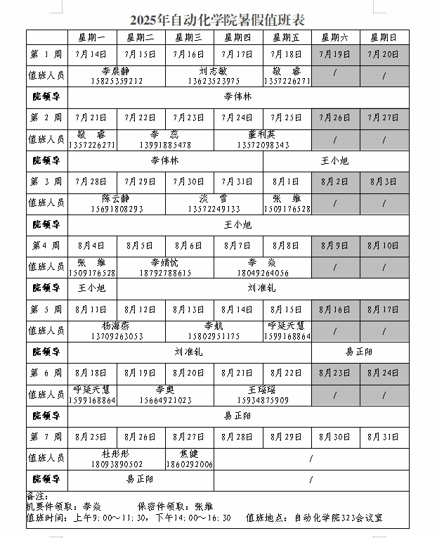 二、各系、实验室、教学中心、学院办公室要切实做好暑假期间安全、保密、保卫工作,主要负责同志手机要保持24小时畅通。放假前各单位要组织安全检查,排除隐患。放假离校要关闭电源、锁好门窗、确保安全。