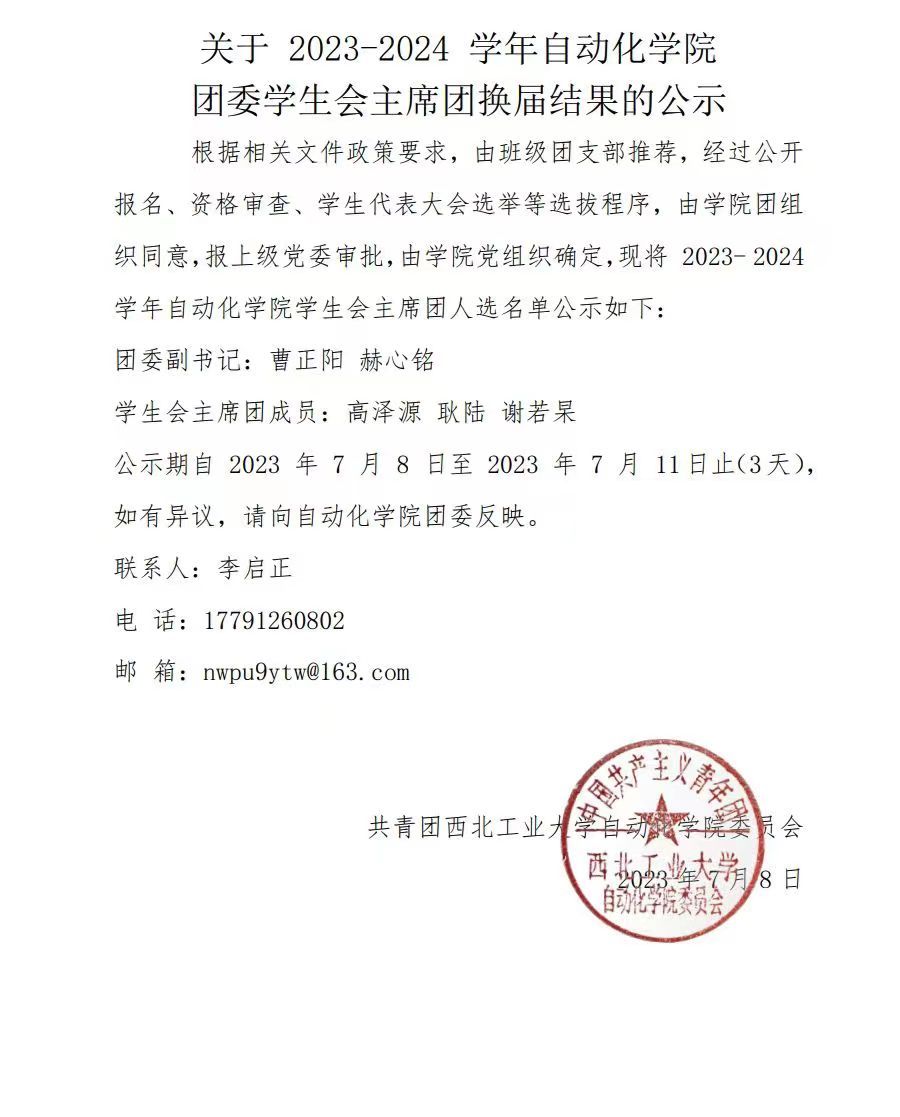 根据相关文件政策要求,由班级团支部推荐,经过公开报名、资格审查、学生代表大会选举等选拔程序,由学院团委组织同意,报上级党委审批,由学院党组织确定,现将 2023- 2024 学年巨乳做爱 学生会主席团人选名单公示如下: