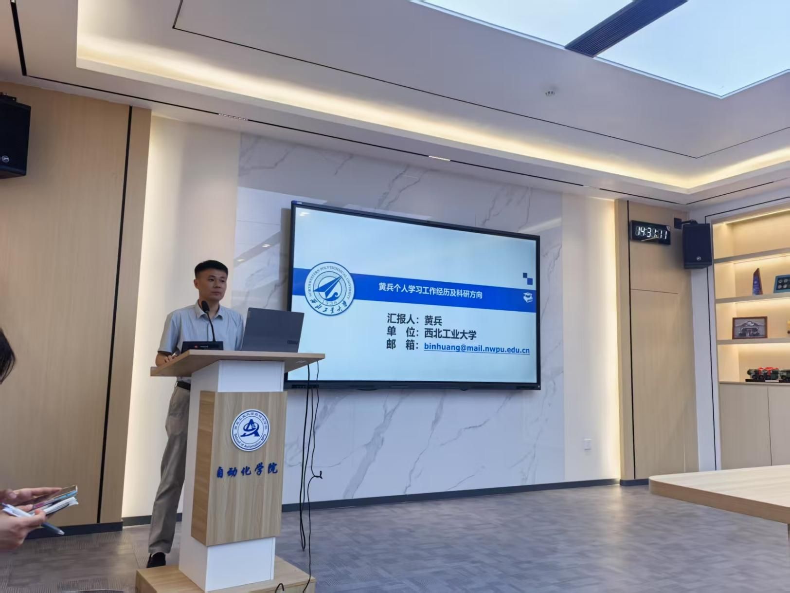 黄兵教授以个人学习经历为切入点,通过生动的动画和视频,向同学们展示了他在无人机集群感知控制领域的研究成果,以及任教后在水面与水下航行器方向的科研进展。他结合自身读研读博期间的学术感悟和指导学生开展工程实践的科研故事,鼓励同学们在读研期间积极探索感兴趣的研究方向,注重理论与实践相结合,勇于投身科技创新实践。